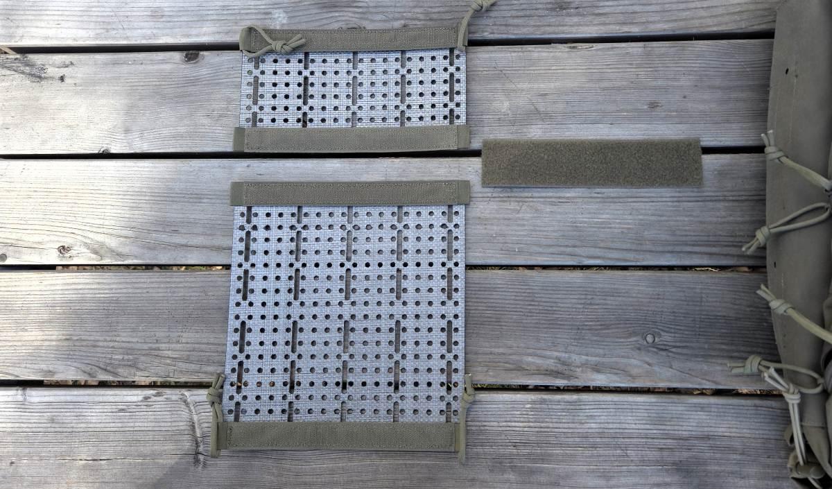 Both feature a laser-cut hole and slot pattern for bungee cord fixation and Velcro attachment.