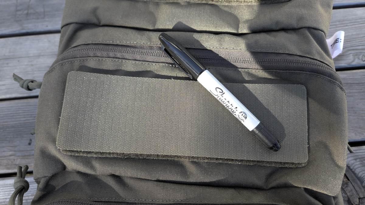 The large olive-colored Velcro covers, which can be used to cover the Velcro areas on the front pockets, are writable on the back. They are included in the delivery.