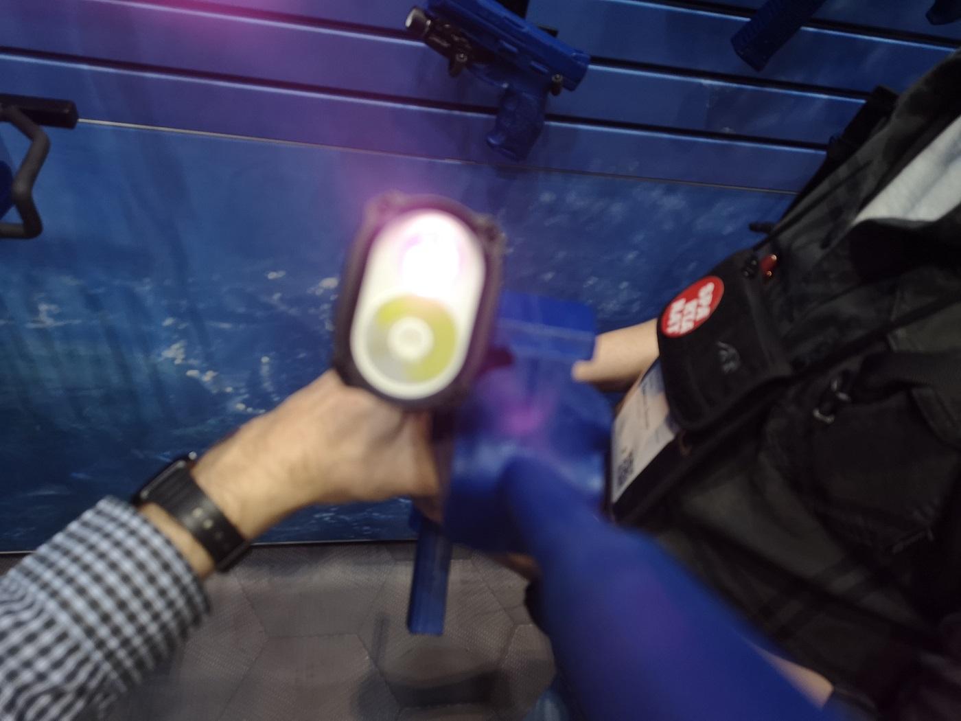 Somehow, I am incapable of taking sharp photos of lamp heads, but one can see what is meant. The IR light is turned on, and below it, the white light LED is visible. The oval head can be rotated continuously so that it always snugly fits the silhouette of the weapon. Overall, we like this concept because it provides a focused beam of light in both spectra.