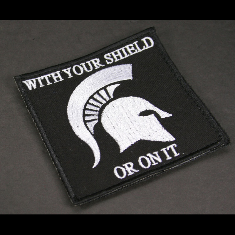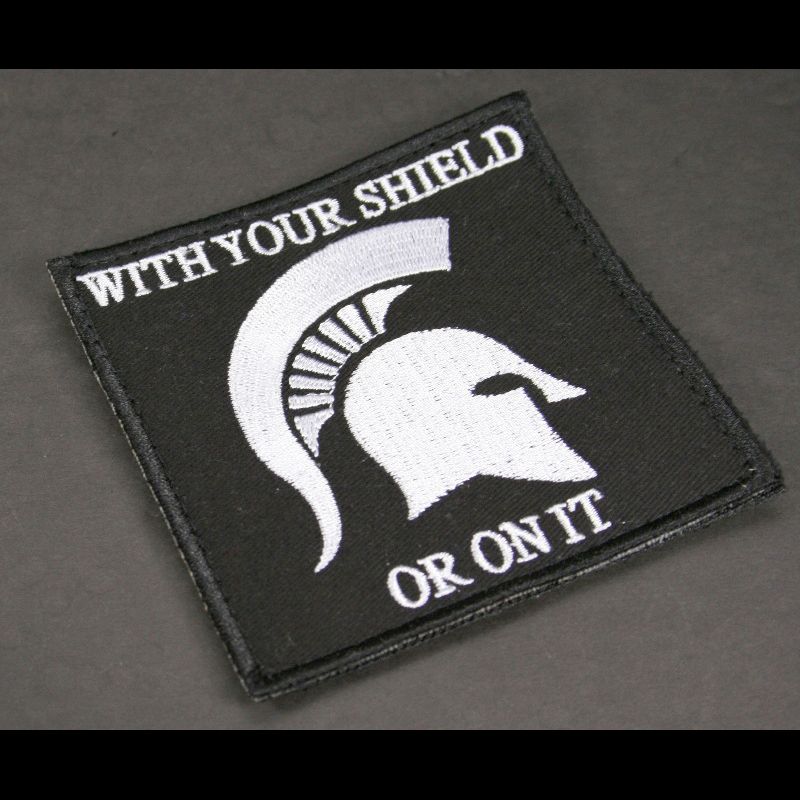 Patchology explains Patches: This patch, seen on the sleeve of Adam Lee Brown, depicts a Greek helmet. Brown, a SEAL, fell in Afghanistan in 2010. The saying on the patch holds a special meaning, referring to the question of true Spartans' return home, "With your shield or on it" – meaning alive or dead, but always with their shield. Brown himself returned with his shield.