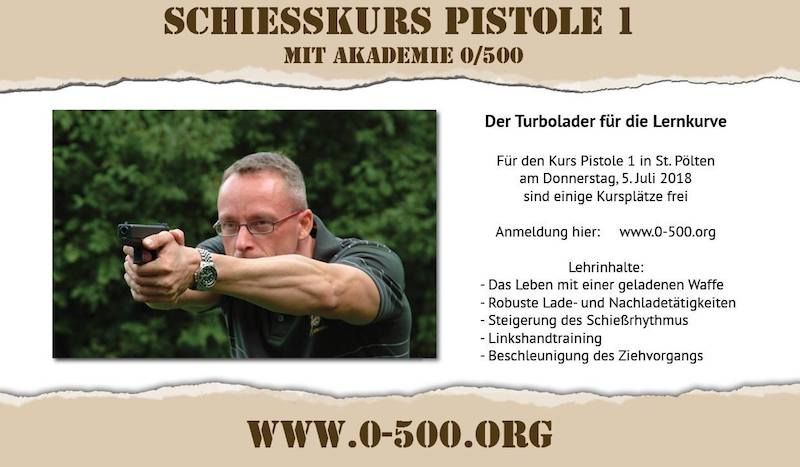 Henning Hoffmann will hold Basic Pistol 1 course on July 1 in St. Pölten, Lower Austria. Individual spots available. Check course program at http://0-500.org/page.php?al=Termine. Visit ACADEMY 0/500 at http://0-500.org.