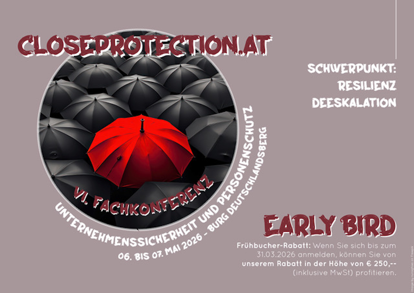 Resilience and de-escalation are the focus of the 6th Conference on Personal Protection & Corporate Security. It will take place at Burg Deutschlandsberg in Austria from May 6–7, 2026. The conference combines operational experience, mental strength, and strategic responsibility. With the kind support of EVALARM, Swiss Platinum Consulting, and the city of Deutschlandsberg.