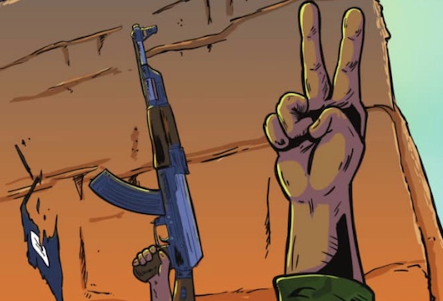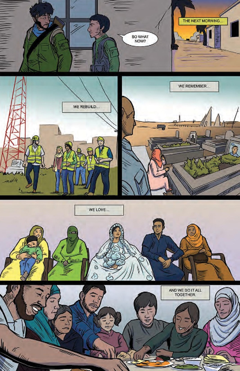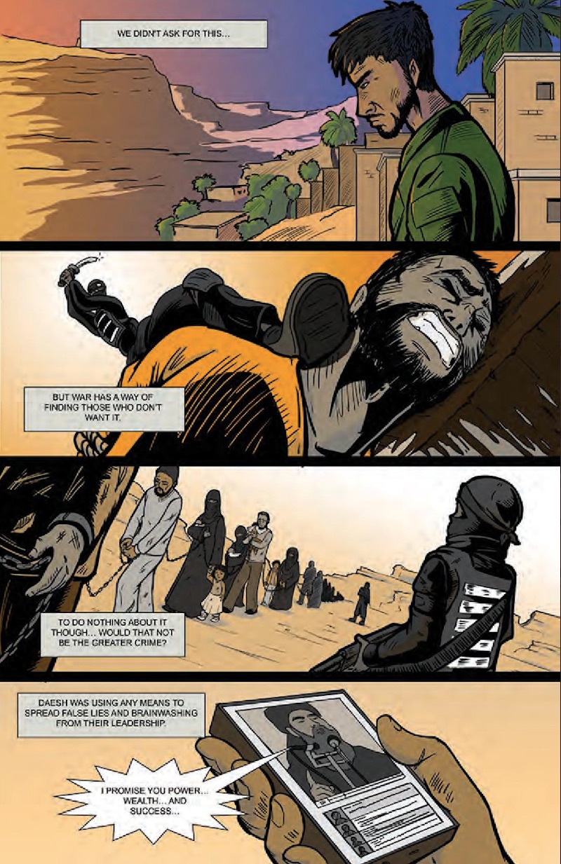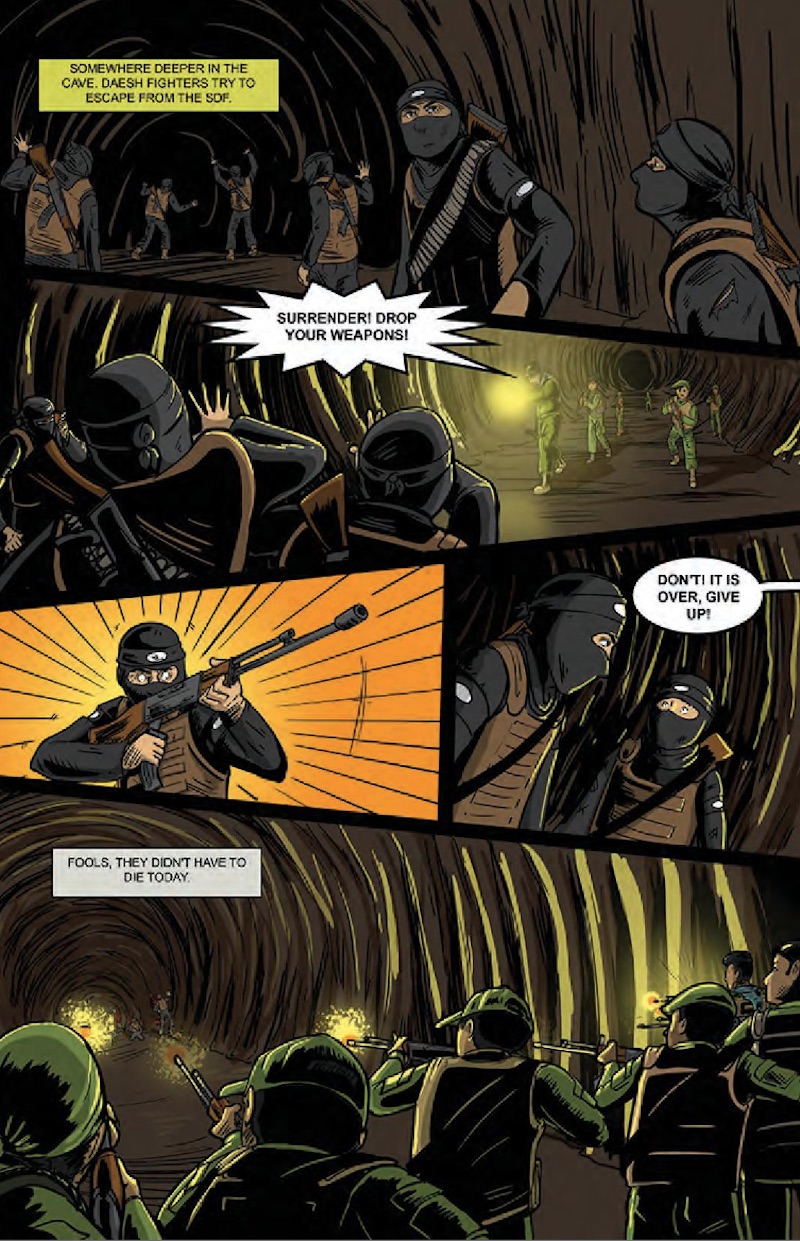 This abstract explores the use of propaganda in war, focusing on a comic brochure used by the Syrian Democratic Forces in Syria. The brochure includes images depicting the fall of the Islamic State flag, actions of ISIS, the loss of ISIS in the war, and the desire for peaceful coexistence.
