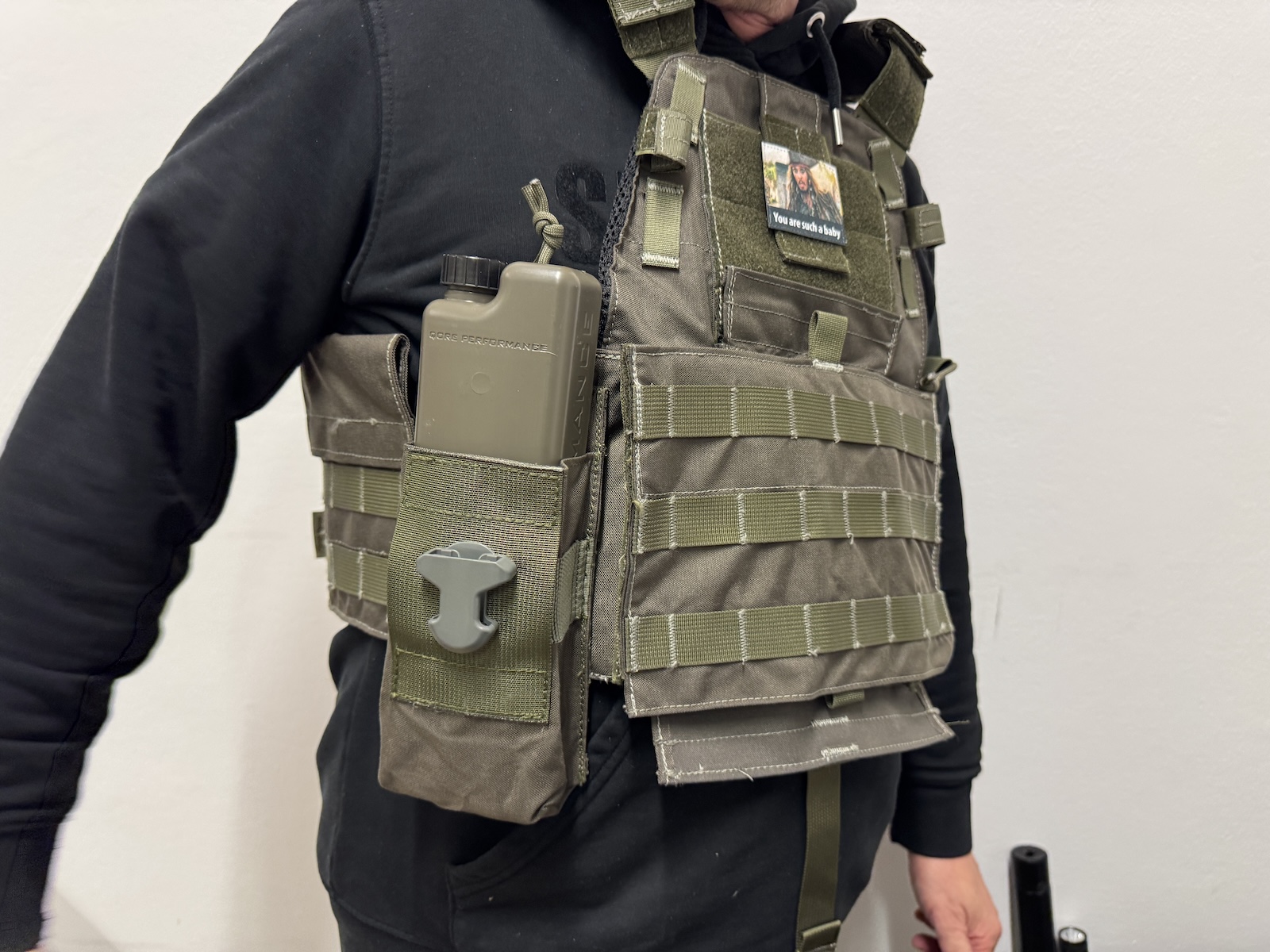 Such a bottle. No, not the man in the plate carrier, but the square piece that is plugged into the plate carrier here. Developed by Felix from REDBEARDTACTICAL together with QORE PERFORMANCE and available at DEFTEX. So you always have something to drink when needed.