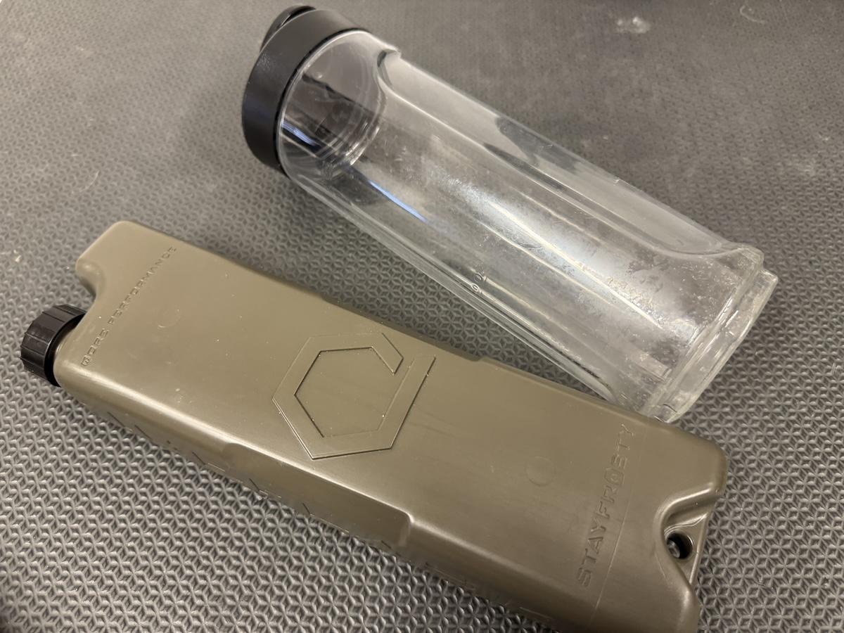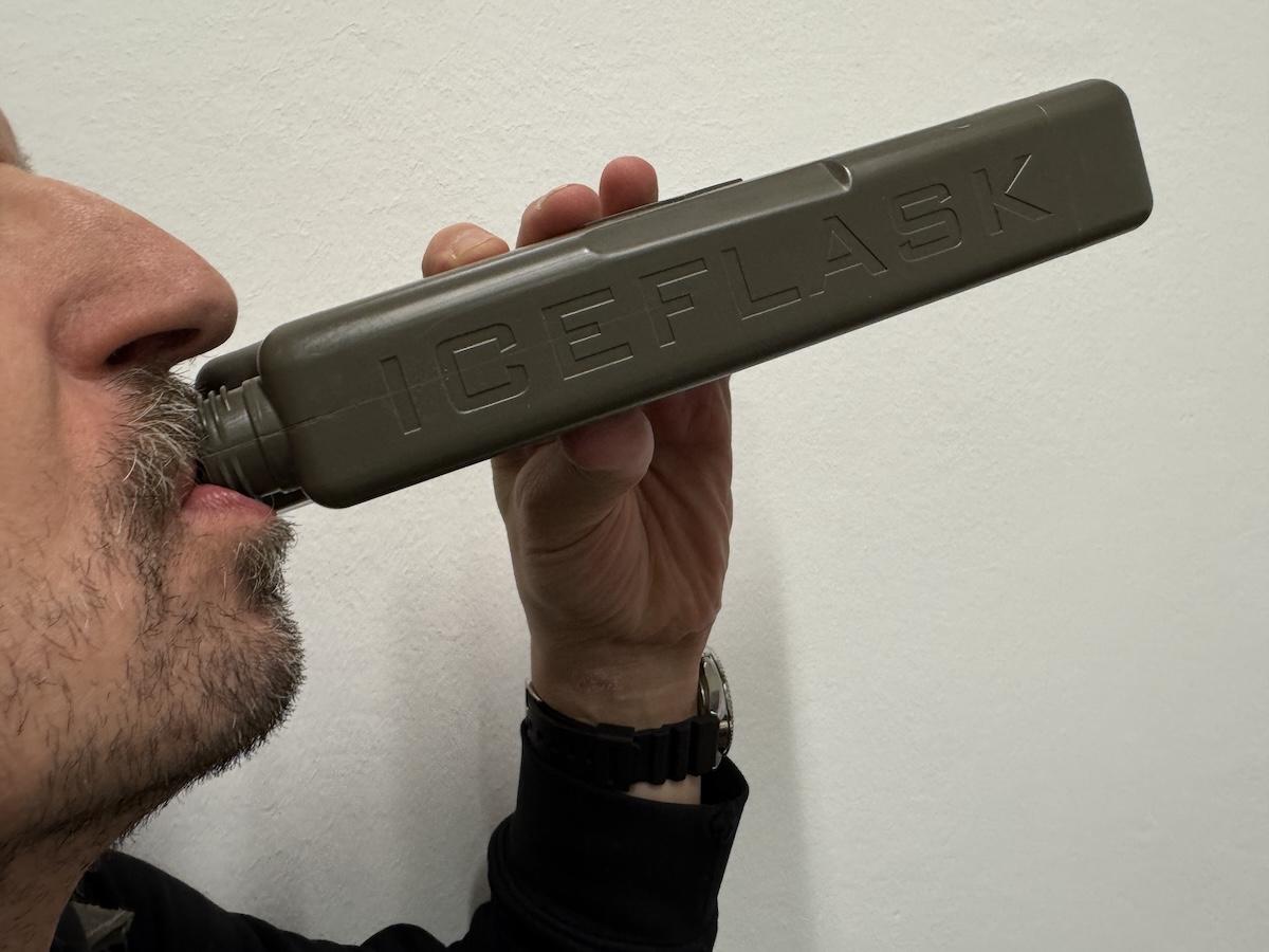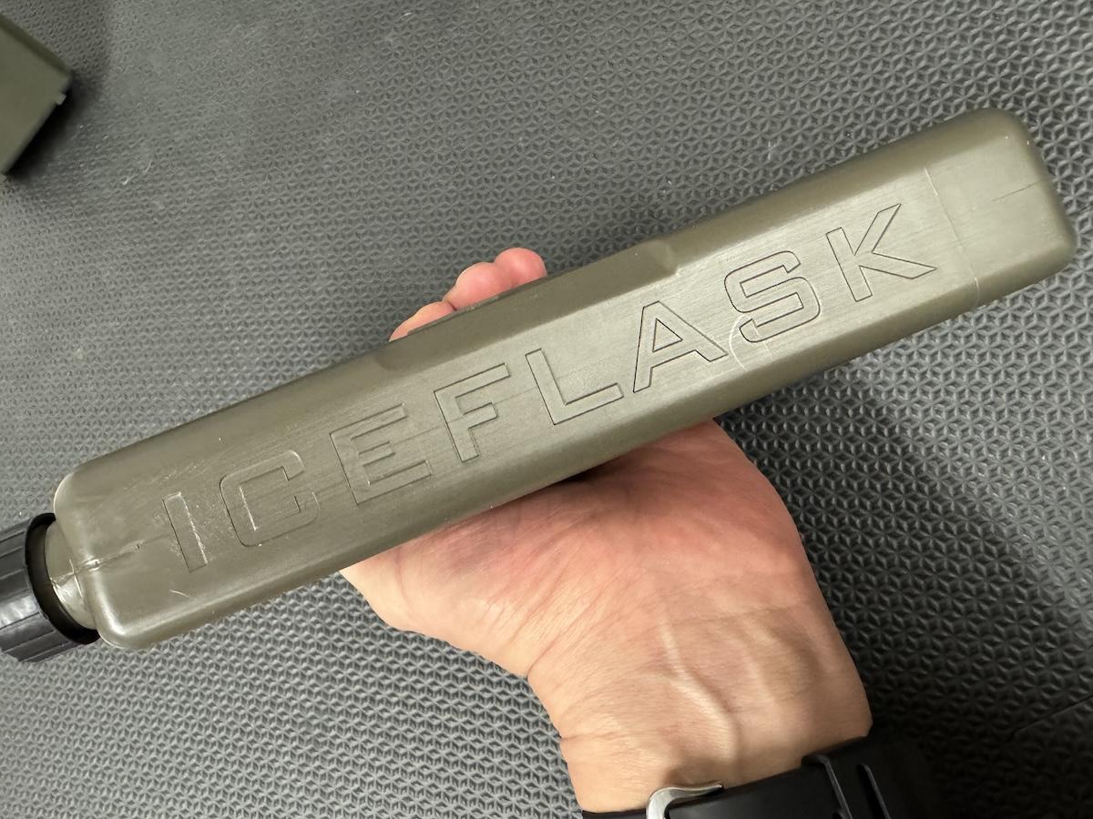 On the side, the name indicates what the thing is called. The shape not only conforms to the body but also allows the bottle to be frozen or heated, then it can cool or warm the carrier during use. And as an ice block, the ICEFLASK fits into the cooler bag. It can also be nicely stacked.
