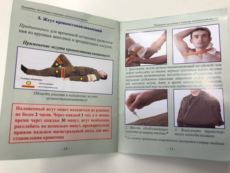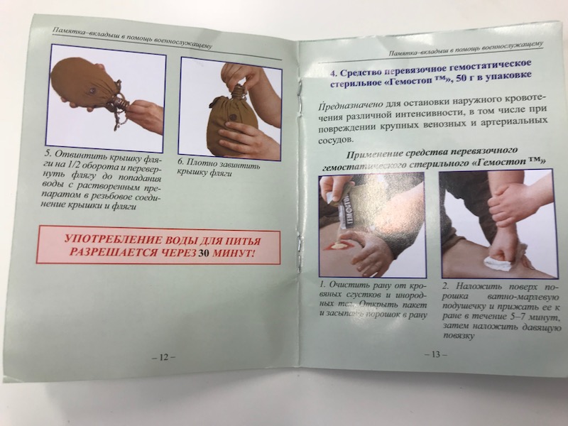 And a first aid brochure that explains how to use the trauma kit. If you can read Russian, you can read, but the pictures are interesting for everyone else as well.
