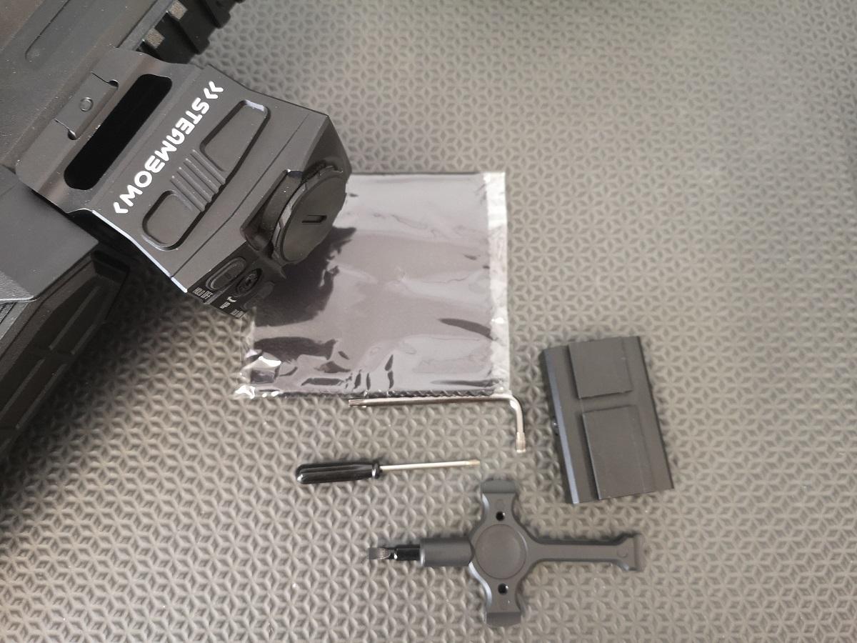 Everything you need is included in the box, except for the CR2032 battery. You will need to purchase this separately. Along with the Raptor SB1x20 Red Dot Sight, there is a Picatinny adapter (compatible with Acro P2), a microfiber cleaning cloth, a small Phillips screwdriver, a Torx key, and a multi-tool. The multi-tool is primarily designed for opening and closing the battery compartment on top.