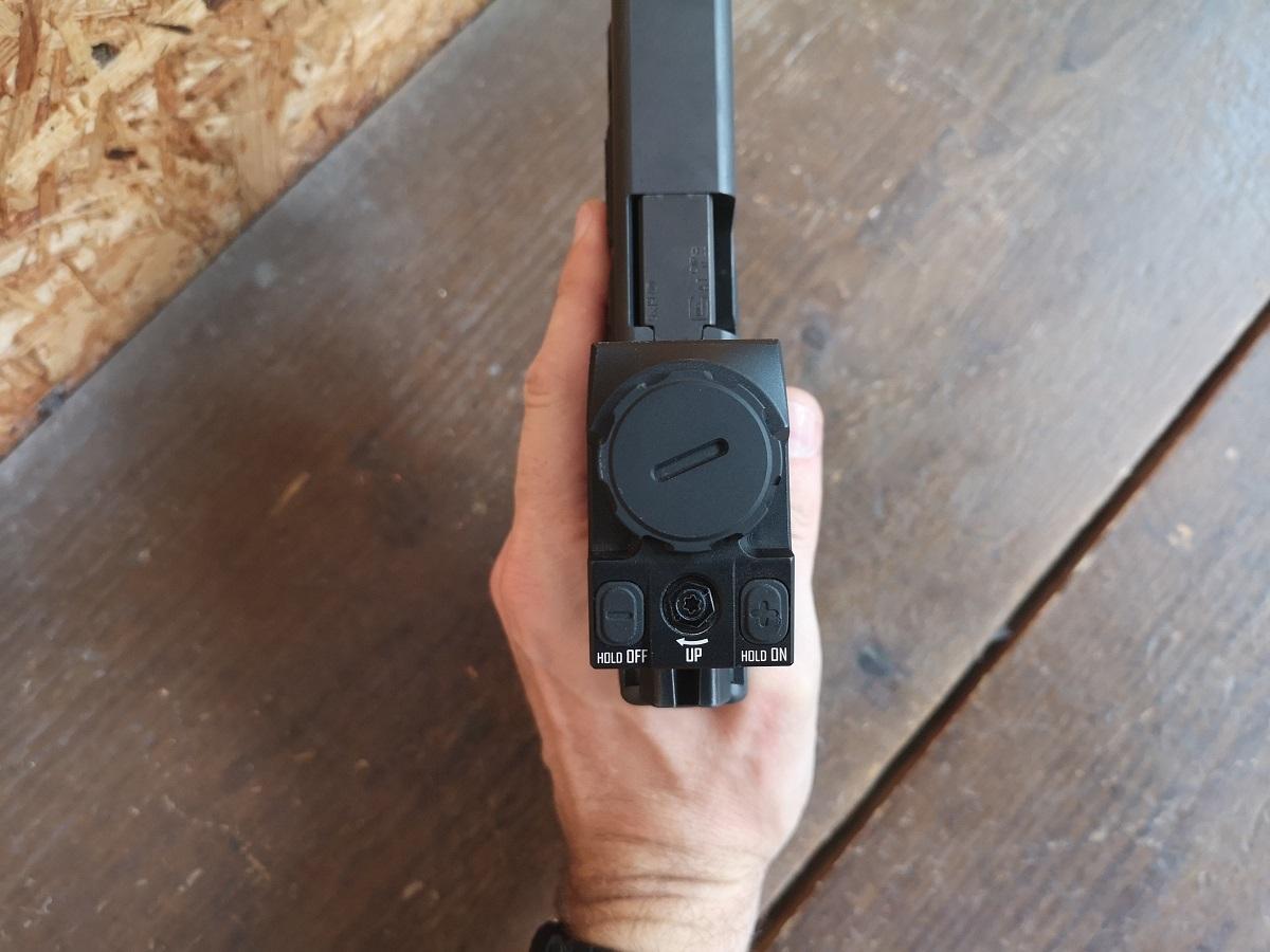 The operation is simple. Thanks to the two buttons on the top back, the sides remain free of buttons that could be accidentally pressed. At first, we weren't sure if this is a good position, but we find it good. It’s something different. Especially on long guns or the crossbow, the operation is somewhat easier.