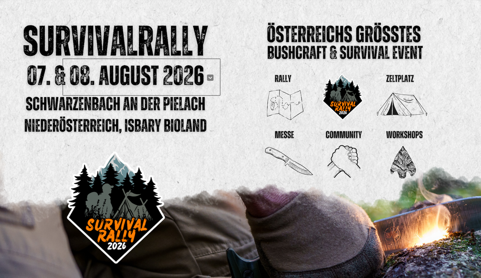The Survival Rally 2026 will take place on August 7 and 8, 2026, in Schwarzenbach an der Pielach, Lower Austria. The organizer describes the event as Austria’s largest bushcraft and survival event.
