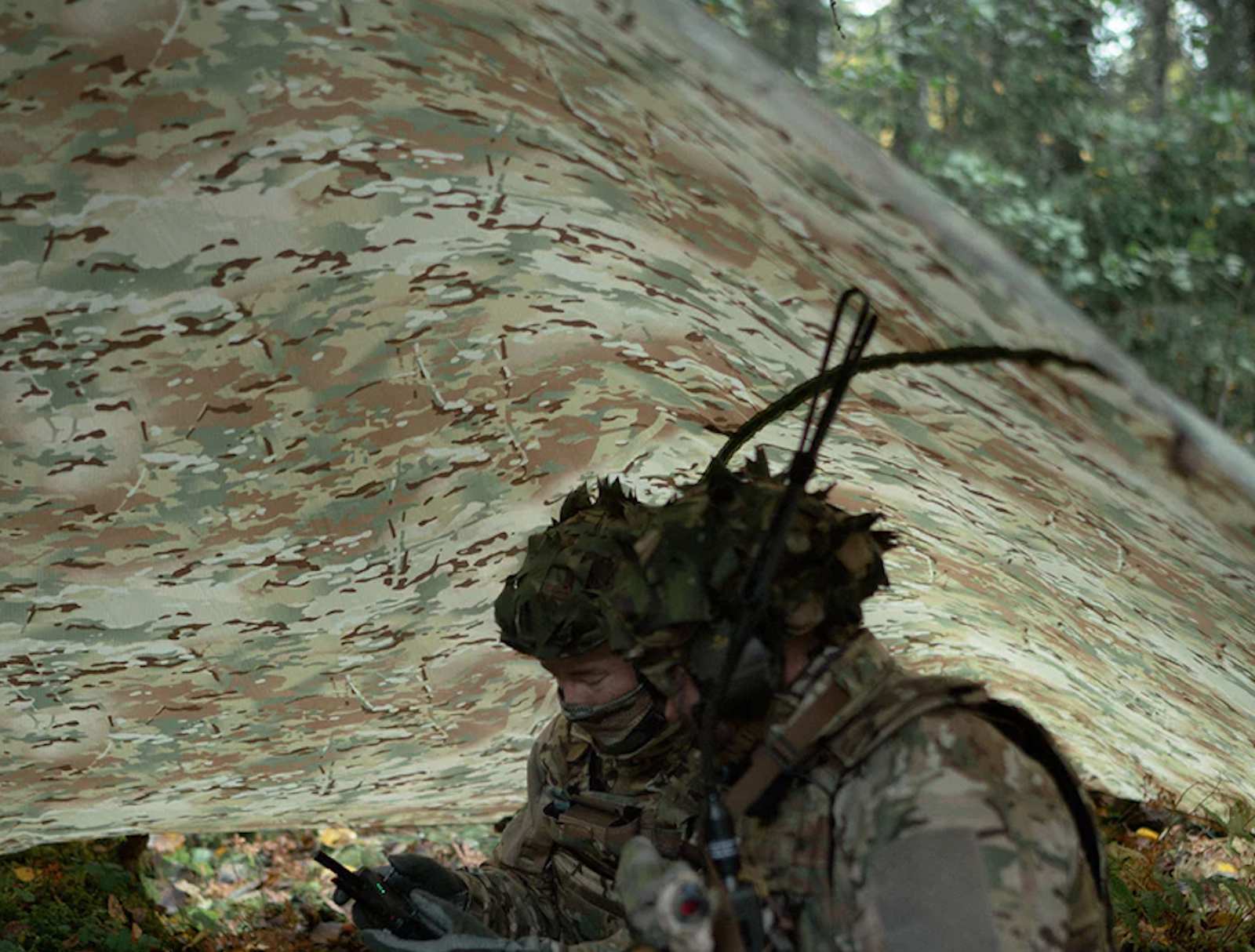 The SAVOTTA tarp is a reliable shelter solution featuring multiple attachment points for versatile setups. Available in green and Multicam, this robust tarp was first produced in Karstula, Finland, and can be purchased directly from SAVOTTA. Its simplicity makes it a practical choice for outdoor enthusiasts.
