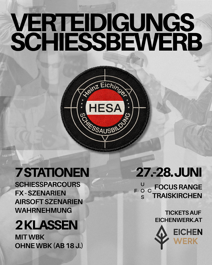 The original HESA Defense Shooting Competition returns on June 27-28, 2026, at Focus Range Traiskirchen, featuring 7 stations focused on defensive shooting. Participants with a firearms ownership license (Class I) can engage in all activities, while those without (Class II) can experience airsoft and perception scenarios.