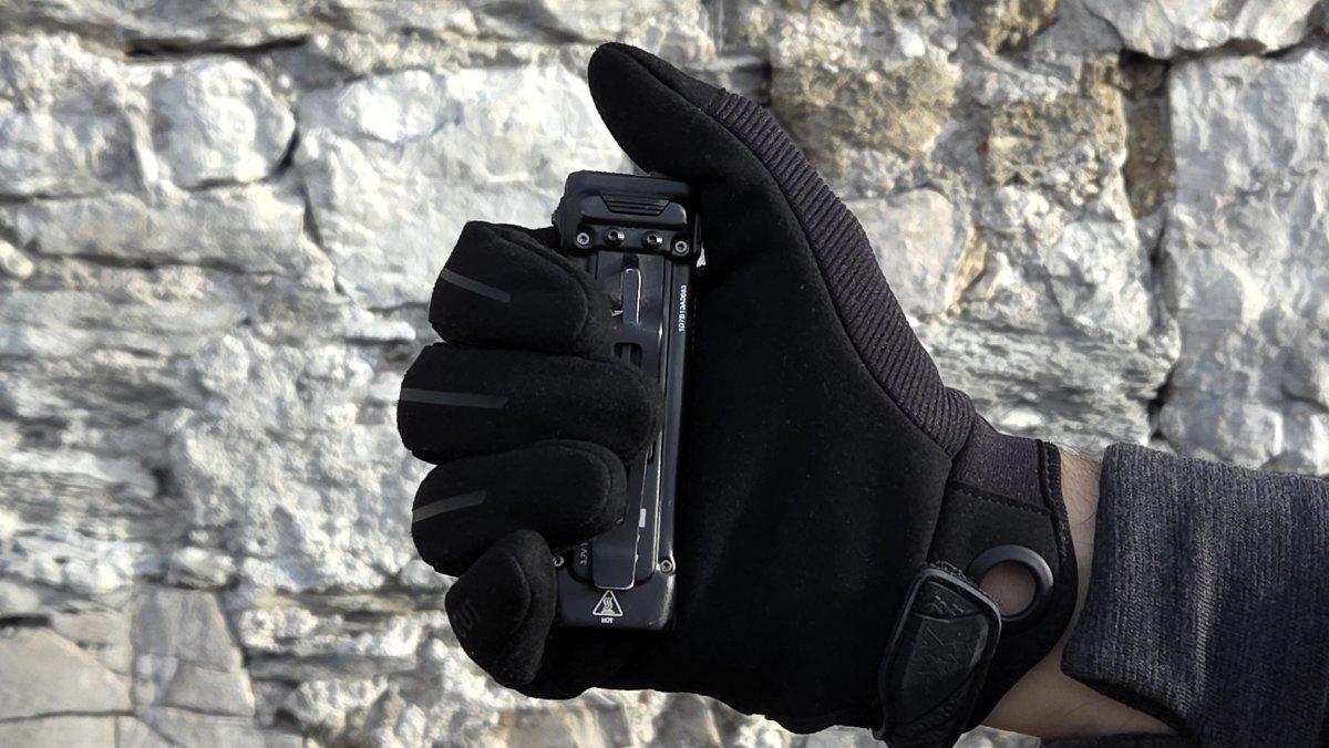 Operating tactical tools is possible with the snug-fitting X-Mission Pro. An example of this is operating the liner lock of the ER Glauca G1.