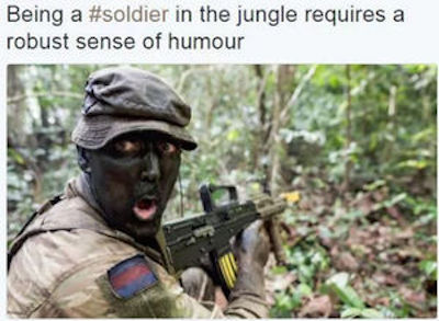 Die britische Armee hat sich für ein auf Twitter veröffentlichtes Foto entschuldigt. Zu sehen ist ein Soldat mit schwarz bemaltem Gesicht im Dschungel, der ein lustiges Gesicht macht. Auf Twitter gab es einen kleinen politisch korrekten Shitstorm, der die weißen Fahnen der britischen Armee nach oben gehen ließ.