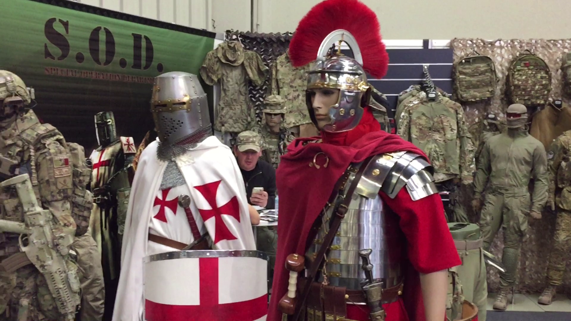 Wir treffen S.O.D. Gear aus Italien auf der IWA. S.O.D. ist bekannt für innovative Bekleidung und Ausrüstung. Hier vorgestellt die Legion Combat Line bestehend aus Combat Jacket und Pants. Sehr lässig: der Legionär und der Kreuzritter am Stand, in Linie mit einer Figurine von einem modern ausgestattetem Soldaten in Multicam. Same shit, different days.