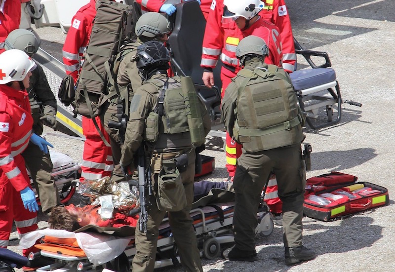 Rettungssanitäter, Medics des Bundesheere (hier vermutlich Jägerbatallion 25) und Cobra Operator gemeinsam bei der Übung. Lustig, dass das Bundesheer mal besser ausgestattet ist: Ops-Core Sentry gewinnt als Helm vor dem sicher auch guten MSA Gallet. Spannend der Vergleich: rechts eine schwere Schutzweste des Bundesheeres, links ein superleichter Tasmanian Tiger Plate Carrier LC am Cobra Mann.