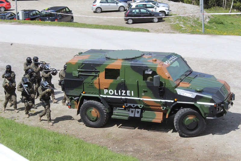 TROMOS heißt „Zerfall“. TROMOS 2017 war am 5. Mai 2017 erstmals in Österreich eine Landesübung, die sich dem Großthema Terror widmete. Annahme: Attentat auf eine Großveranstaltung. Sinn: Zusammenarbeit der Einsatzkräfte von Rettung, Polizei und Militär. Wir picken uns nur die interessanten Gearaufnahmen heraus: Oben im Bild geht die Militärpolizei vor. Sie wird als starke Unterstützungkraft für den urbanen Bereich aufgebaut, dementsprechend schwere Plattenträger, Helme mit Vollvisier, direkter Einsatz gegen den Terror ist das Ziel.