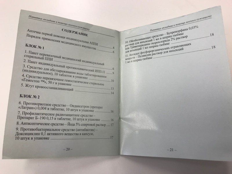 Und eine Erste Hilfe Broschüre, die die Anwendung des Traumakits erklärt. Wer Russisch kann, darf lesen, die Bilder sind aber für alle anderen auch spannend.