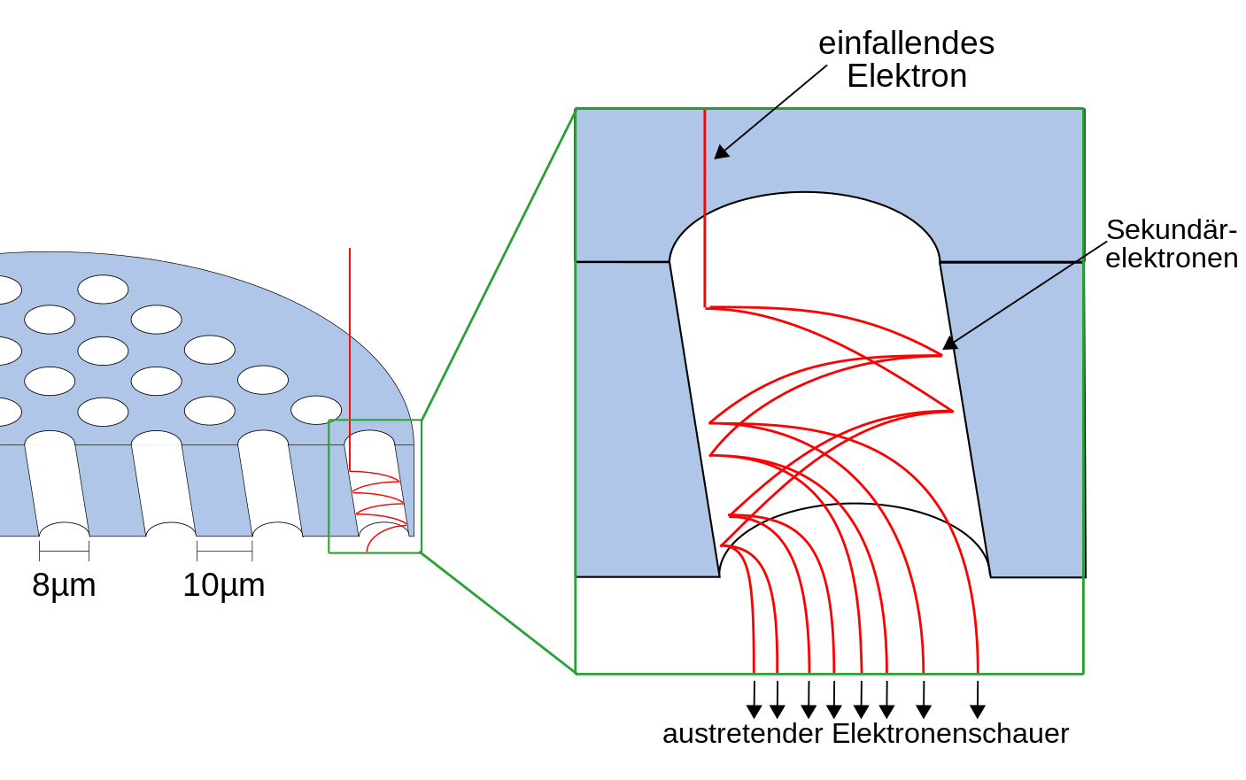 Die Kanäle sind um ca. 10° gegen die Plattenachse verkippt, sodass die einfallenden Elektronen mit Sicherheit mehrmals die Kanalwand treffen. Sie werden dann von einer zwischen den Platten längs der Kanäle anliegenden elektrischen Spannung beschleunigt und vervielfachen sich bei jedem Wandstoß, jeder einzelne Kanal verhält sich somit wie ein mikroskopischer Kanalelektronenvervielfacher, oder der stufenweise Sekundärelektronenvervielfacher in Photomultipliern. An der Austrittsseite hat sich die Zahl der Elektronen durch Vielfachstöße mit der Kanalwand um das ca. 1000-fache erhöht.