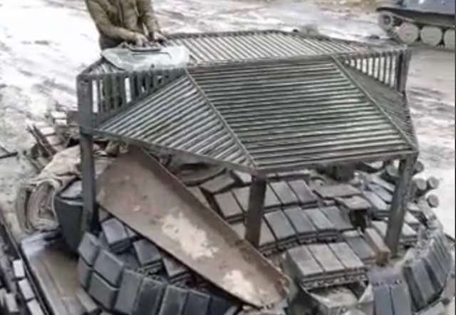 Hier ist das ganze Video zu sehen. Die Ukraine – als naheliegender Gegner – hat ja einiges an türkischen Drohnen gekauft. Da könnte es schon Sinn machen, dass man sich improvisiert schützt gegen das, was sich von oben auf einen Panzer stürzt.
