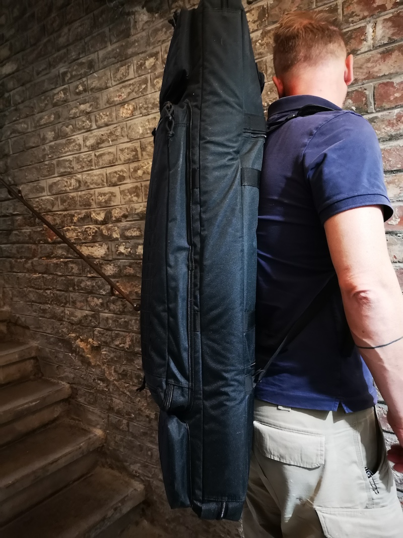 Wir sagen euch: es kommt auf die Größe an. 106 Zentimeter bringt die HERA Rifle Bag auf den Boden neben uns. Der Größenvergleich macht sicher: das ist groß.
