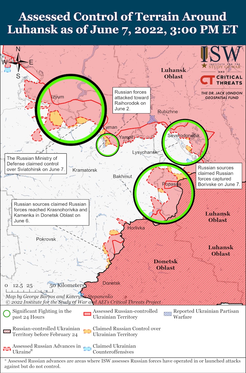 Die russischen Streitkräfte haben ihre Offensivoperationen an mehreren Orten in der Ostukraine fortgesetzt, konnten aber am 7. Juni keine bestätigten Erfolge bei Bodenangriffen erzielen. Die russischen Streitkräfte haben wahrscheinlich den größten Teil von Sewerodonezk eingenommen, aber das ISW kann die genaue Kontrolle über das Gebiet innerhalb der Stadt nicht bestätigen.