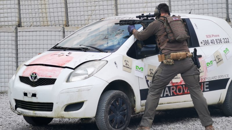 Nach dem Einladen, wieder zum Beifahrer-Sitz laufen und auf ein Stahlziel mit der Pistole feuern, welches in etwa 15-20 Meter entfernt ist.